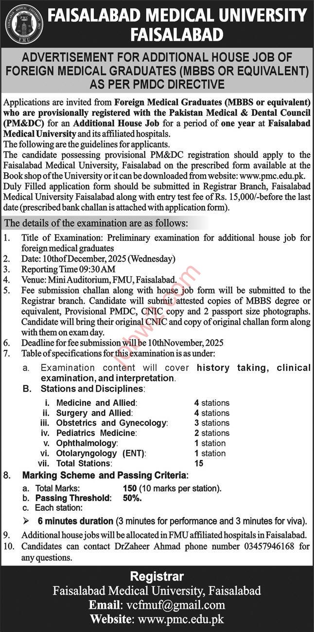 If you are looking for govt jobs 2025 or the latest government jobs in Faisalabad, then this opportunity at Faisalabad Medical University (FMU) is perfect for you. Faisalabad Medical University has announced new jobs 2025 for Foreign Medical Graduates (MBBS or equivalent) who are provisionally registered with the Pakistan Medical and Dental Council (PMDC). These positions are for an Additional House Job for a period of one year at FMU Faisalabad and its affiliated hospitals.