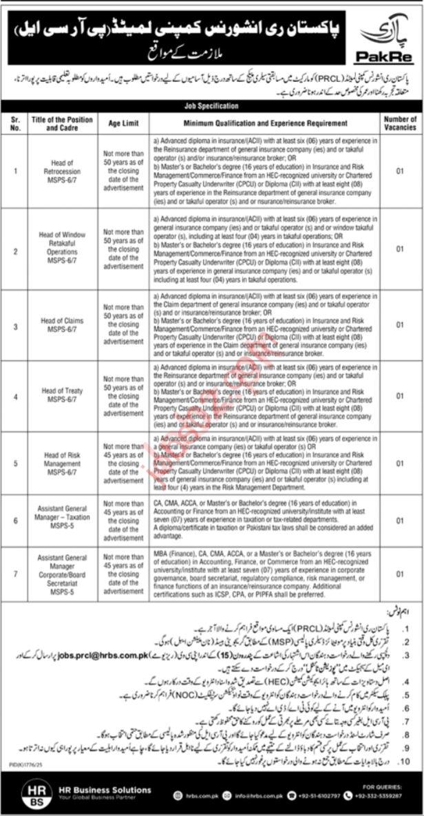 The following positions are announced under Pakistan Reinsurance Company Limited Islamabad Jobs 2025: